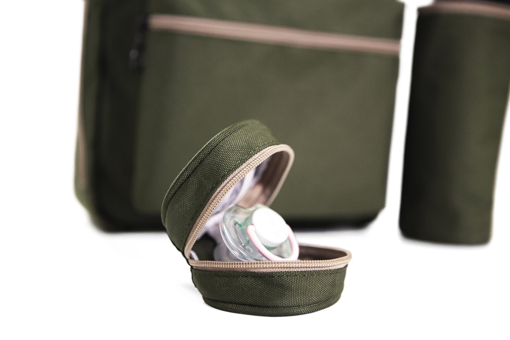 Cool green Gogi for those who like it calm and peaceful and who prefer it in the colors of the nature. A stylish and adaptable diaper backpack designed by parents that has eight interior and exterior pockets. Baby changing mat Toto, insulated bottle bag Bobi and clipped pacifier bag Mini all included