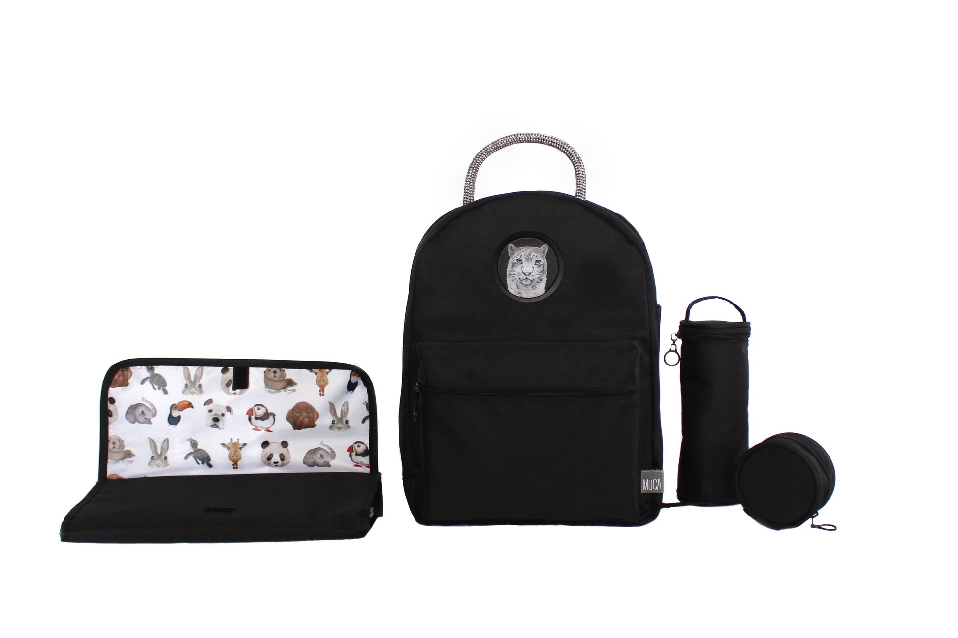Regal black Gogi for those who like it with a touch of dark twist. A stylish and adaptable diaper backpack designed by parents that has eight interior and exterior pockets. Baby changing mat Toto, insulated bottle bag Bobi and clipped pacifier bag Mini all included