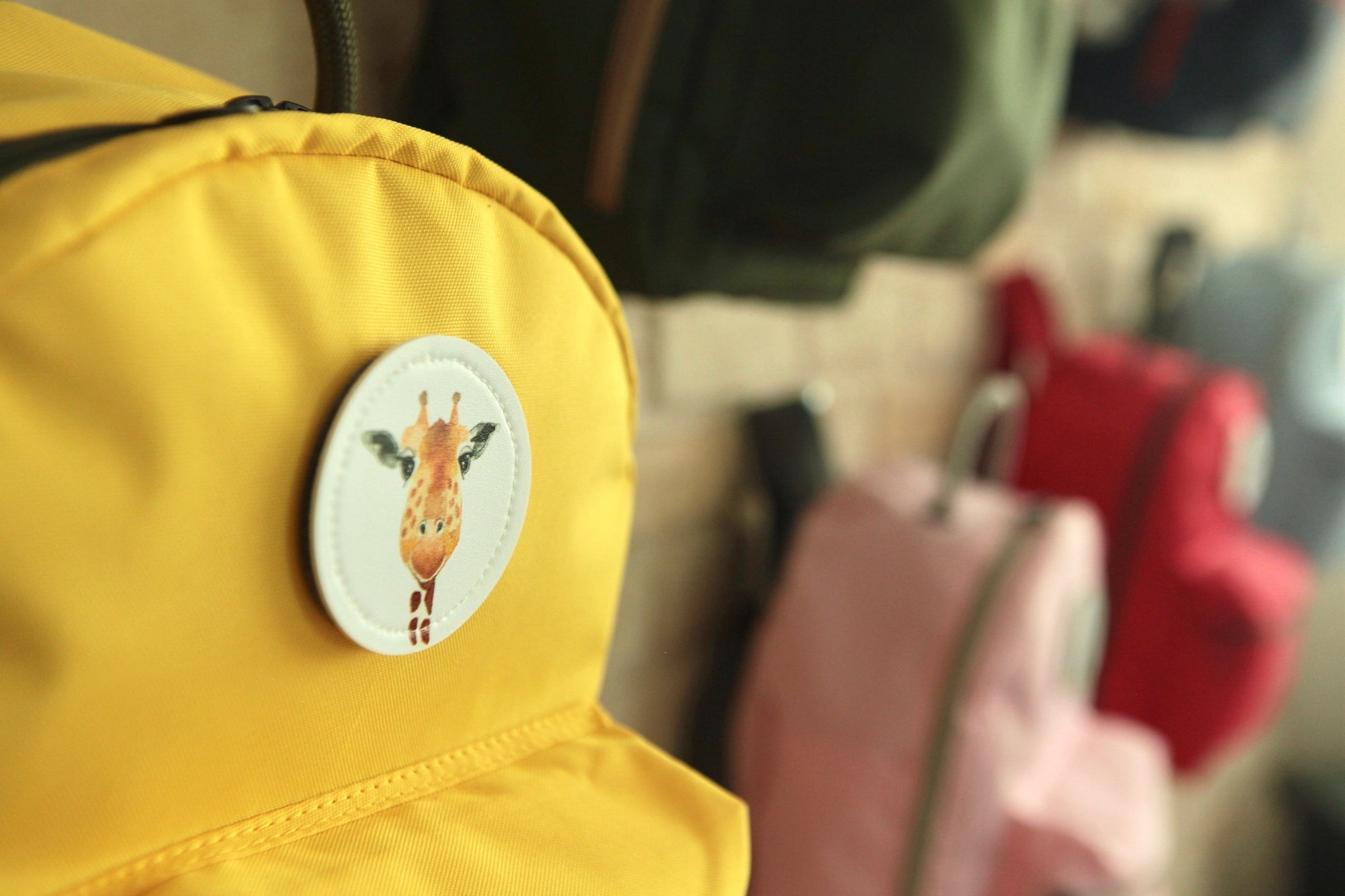 - Patented illustration printed on white faux leather / hand-sewn grey Velcro on the back