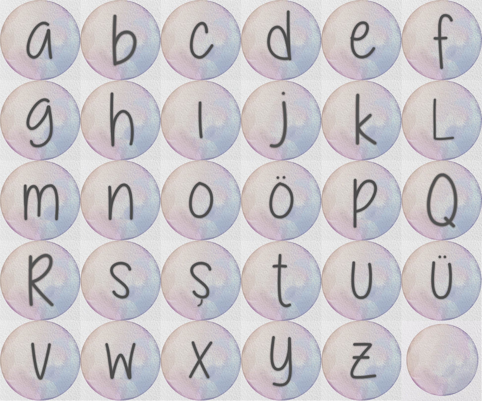 Alphabet AGUs are letters are illustrated digitally and printed on real watercolor backgrounds.