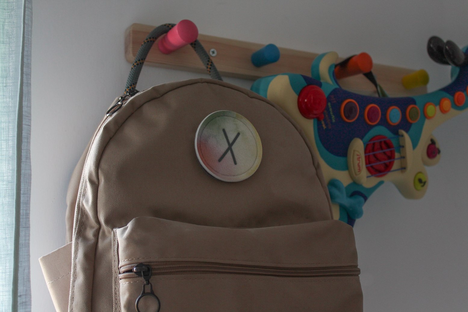 - illustration printed on white faux leather / hand-sewn grey Velcro on the back