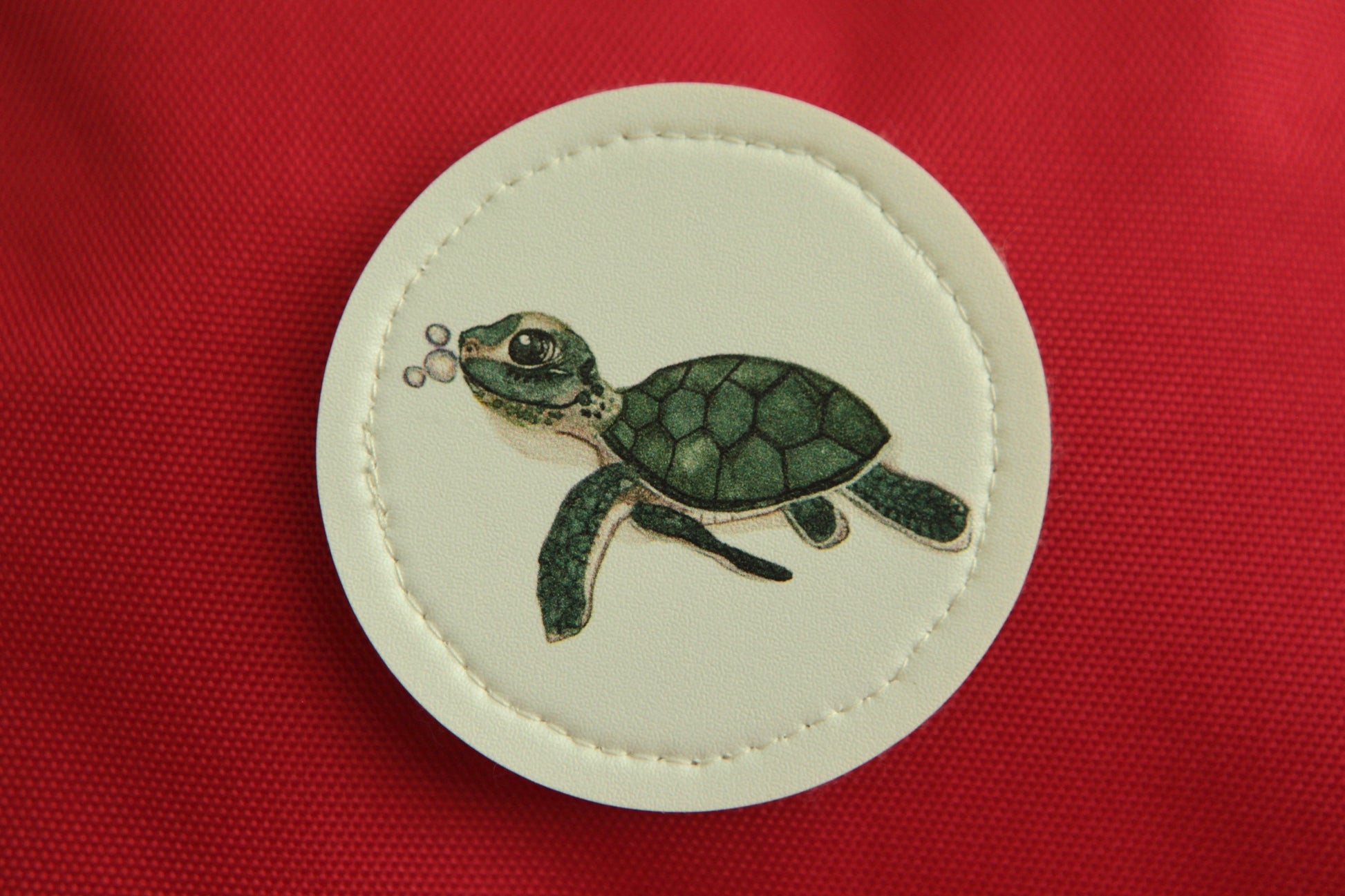 - Patented illustration printed on white faux leather / hand-sewn grey Velcro on the back